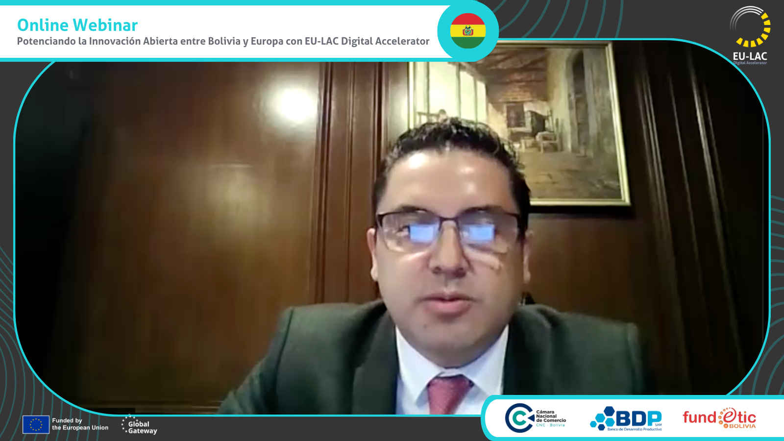 Durante el webinar, Gustavo Jauregui, Gerente General de la Cámara Nacional de Comercio, compartió tendencias y beneficios tecnológicos, así como la participación activa de Bolivia en proyectos de innovación empresarial y transformación digital financiados por la Unión Europea, por ejemplo, el fondo europeo AL INVEST