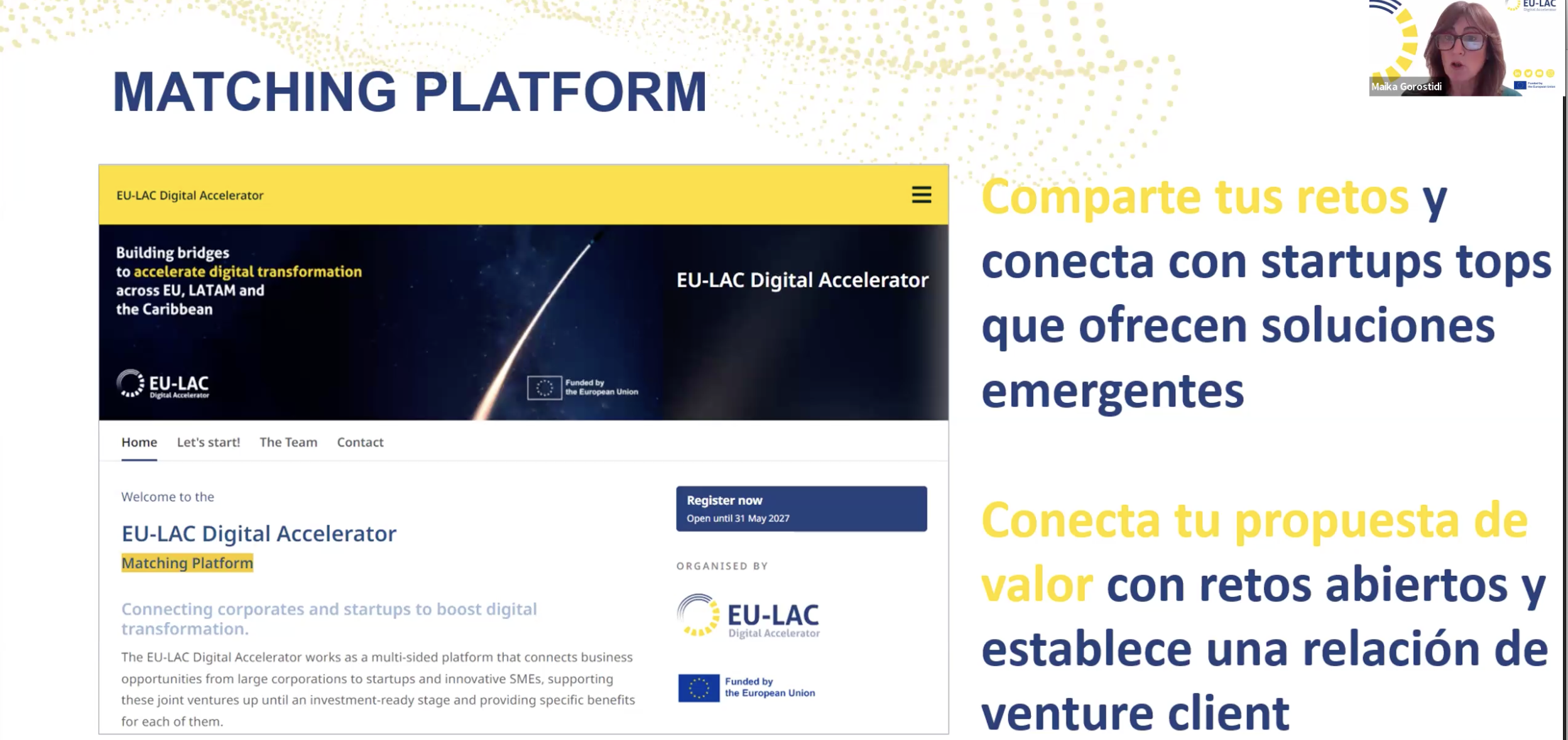 “De los 55 retos que tenemos en la plataforma de matching, 22 están buscando soluciones digitales de América Latina. Para conectarse con ellas, solo hace falta registrarse en la plataforma de matching, buscar los retos a los que puedan dar solución con su innovación digital, enviar la propuesta de valor por escrito y formalizar una alianza. Posteriormente podrán beneficiarse de los servicios de aceleración de EU-LAC Digital Accelerator cuando abramos convocatoria que se ajuste al reto y solución,” explicó Carrandi.