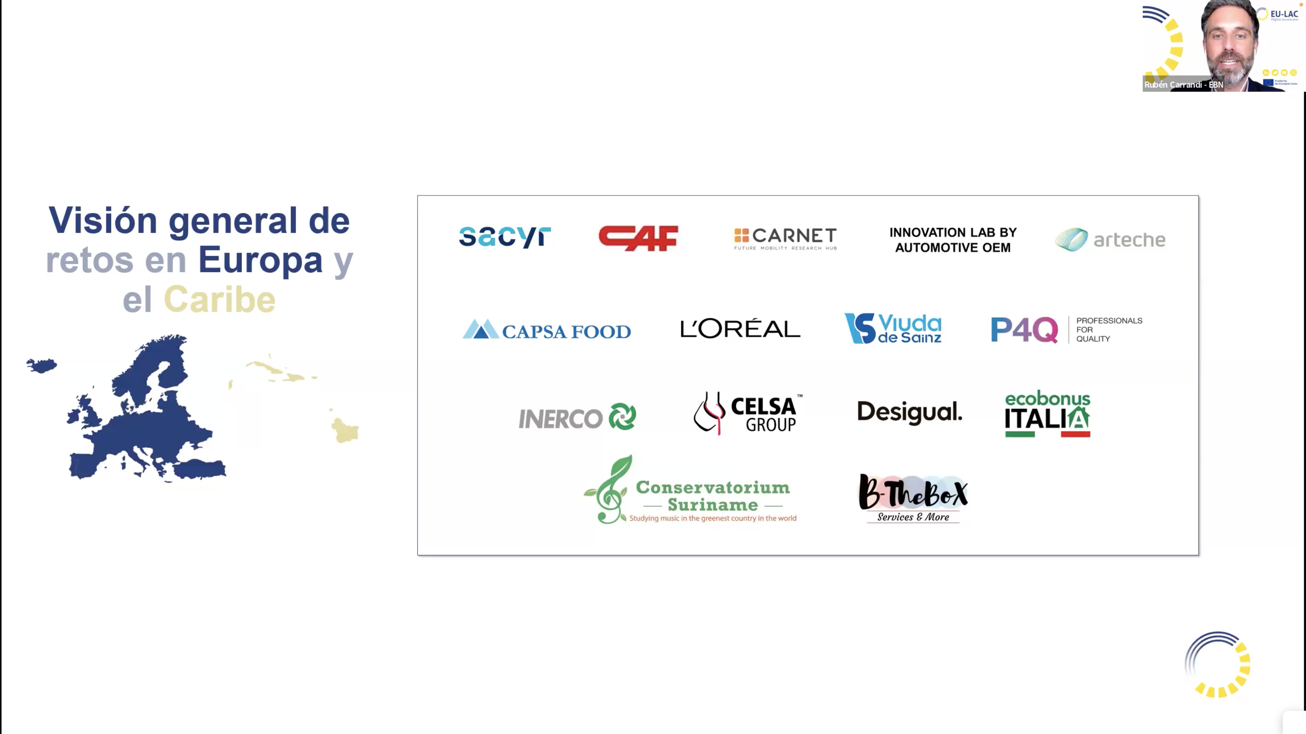 Las alianzas que se generan en la plataforma comienzan con retos corporativos digitales, los cuales representan oportunidades de negocio para las pymes y startups innovadoras bolivianas. Ruben Carrandi, Senior Project Manager en European Business Network (EBN), presentó ante la audiencia las oportunidades de negocio concretas y las áreas principales de Europa y el Caribe que buscan conectar con Latinoamérica.