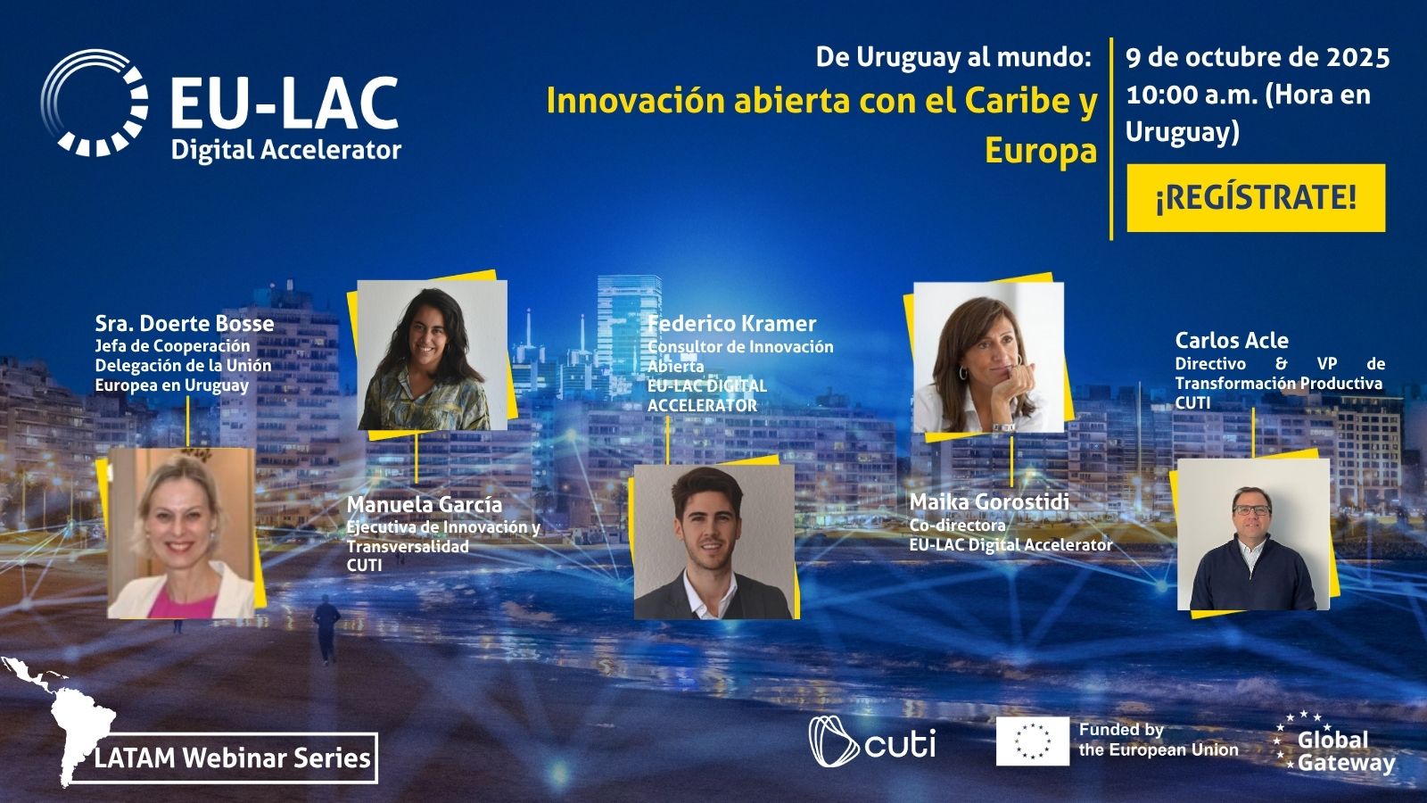 La Delegación de la Unión Europea en Uruguay y CUTI, la Cámara Uruguaya de Tecnologías de la Información, en colaboración con EU-LAC Digital Accelerator, te invita al webinar: De Uruguay al mundo: Innovación abierta con el Caribe y Europa, para empresas de Uruguay con oportunidades únicas de colaboración e innovación abierta junto a corporaciones y startups de Europa y el Caribe.